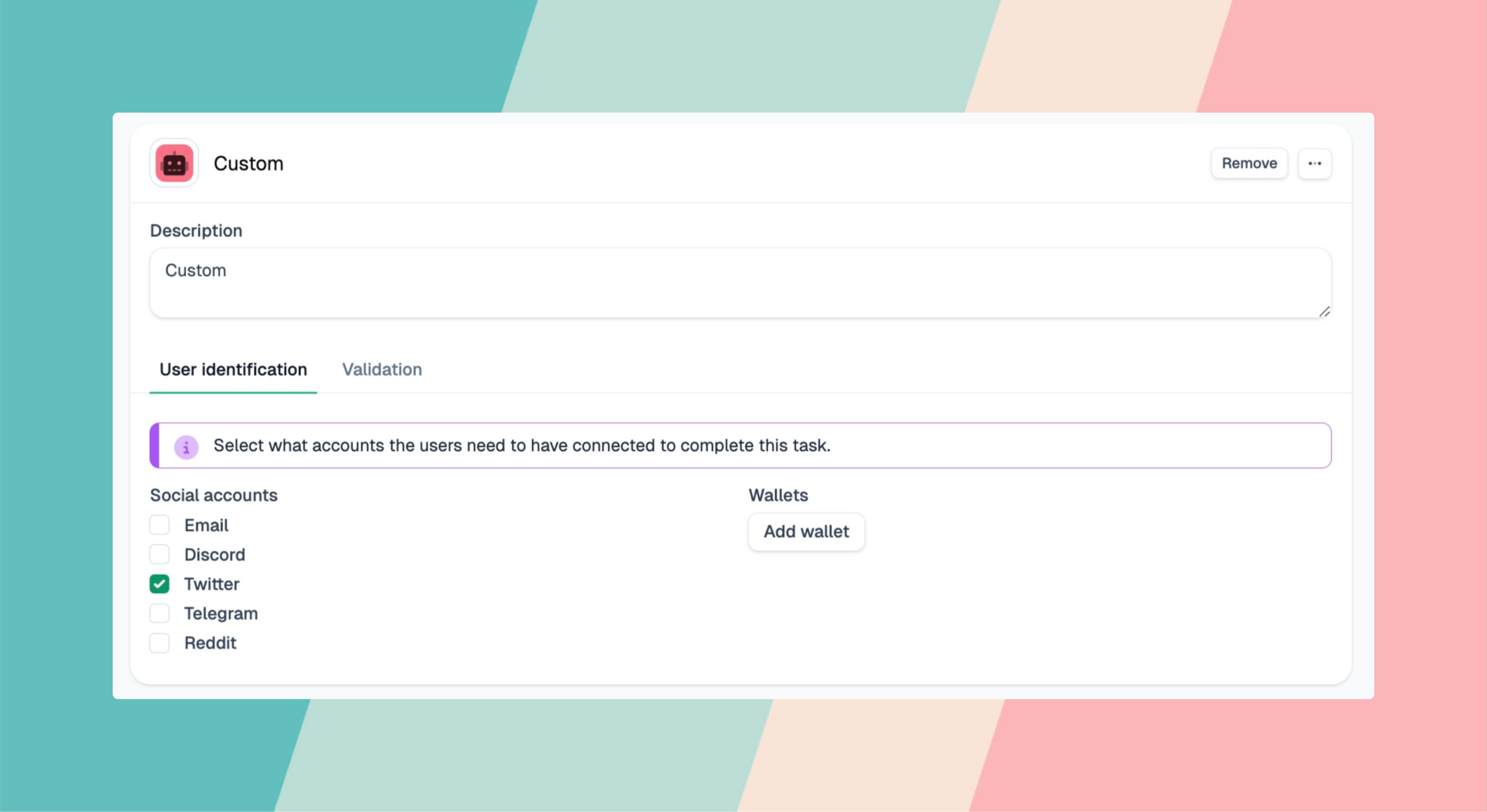 <figure><img src="https://1542229437-files.gitbook.io/~/files/v0/b/gitbook-x-prod.appspot.com/o/spaces%2Fu8TrWRyvdpP97AjvHh9W%2Fuploads%2Fgit-blob-370bbacd9044ab8e12b2f13dac0c0a412b9c72b1%2Fscreenshot%20(17).png?alt=media" alt=""><figcaption><p><em>Configure which connected accounts users need to complete your task</em></p></figcaption></figure>