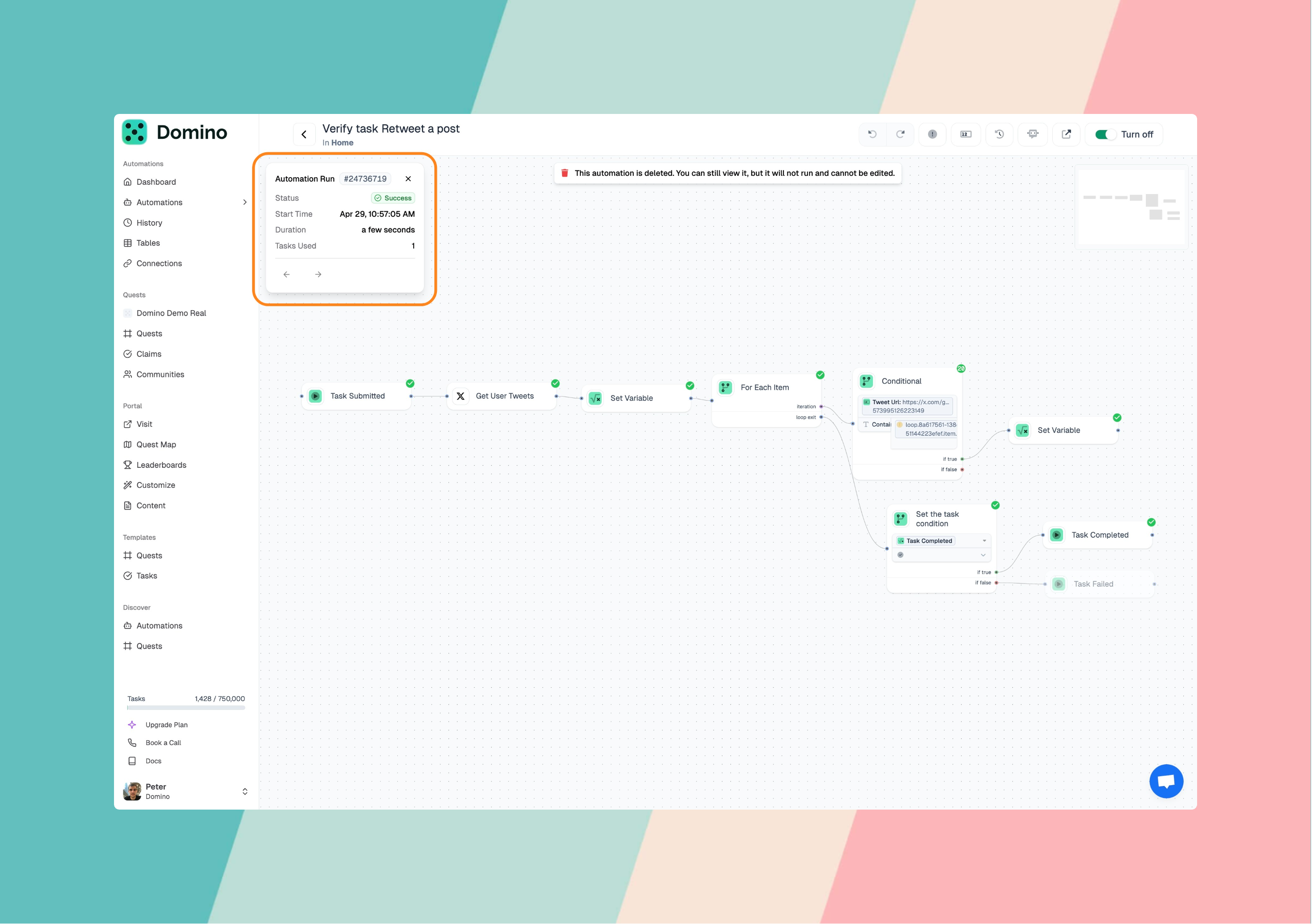 Domino's quest system uses automated verification to validate user submissions. When reviewing quest claims, you can access the underlying automation runs to understand exactly how tasks were validated, diagnose issues, and gain insights into user interactions. This guide explains how to interpret automation run data and use it for troubleshooting verification issues.